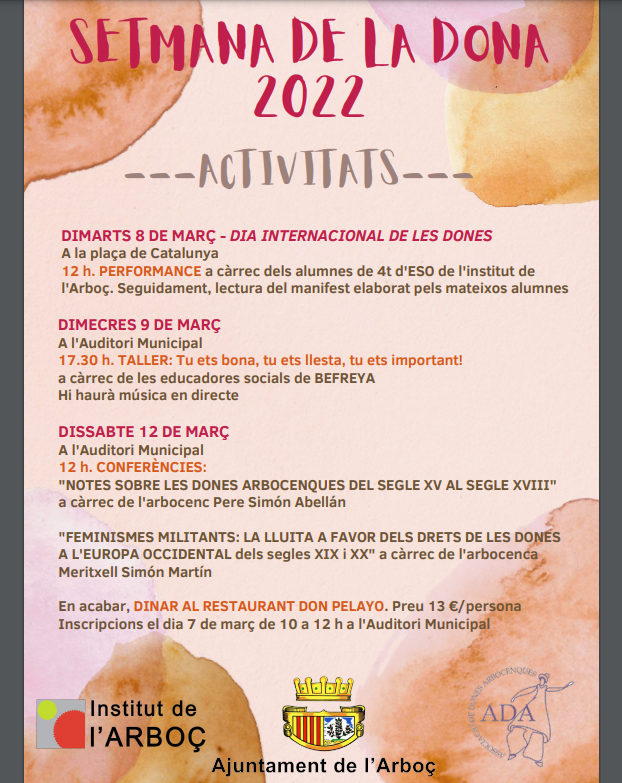 El dissabte 12 de març a les 12h a l’Auditori Municipal es faran dues conferències de temàtica feminista: "NOTES SOBRE LES DONES ARBOCENQUES DEL SEGLE XV AL SEGLE XVIII" a càrrec de l'arbocenc Pere Simón Abellán i seguidament, "FEMINISMES MILITANTS: LA LLUITA A FAVOR DELS DRETS DE LES DONES A L'EUROPA OCCIDENTAL dels segles XIX i XX" a càrrec de l'arbocenca Meritxell Simón Martín. En acabar es farà un dinar al Restaurant Don Pelayo. Preu 13 €/persona. Inscripcions a l'Auditori Municipal