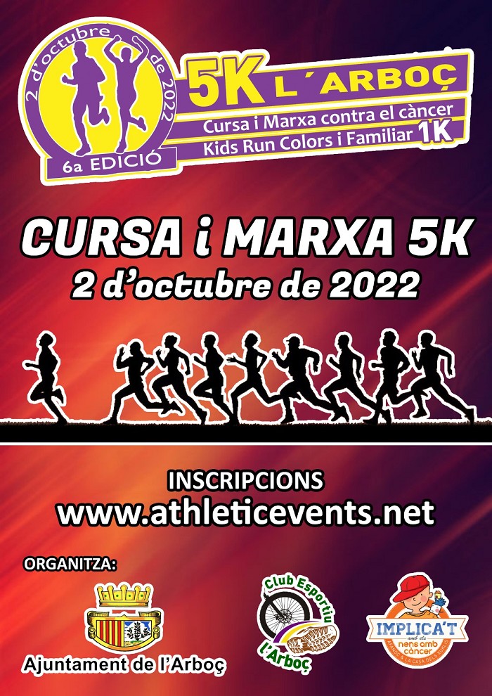 L’Arboç, 8 de setembre de 2022. El diumenge 2 d’octubre tindrà lloc pel circuit urbà de la vila de l’Arboç la sisena edició de la Cursa i Marxa Solidària contra el Càncer, una iniciativa promoguda per la regidoria d’Esports de l’Ajuntament de l’Arboç i organitzada conjuntament amb el Club Esportiu l’Arboç. Enguany es recupera la Cursa Kids Run Colors i Familiar d’1 Km en la que serà la 3era edició per tal d'oferir la possibilitat de participar fins i tot als més petits de casa.