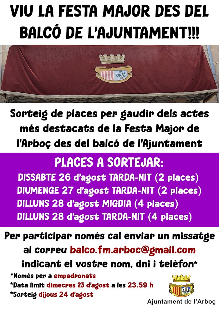 L’Ajuntament de l’Arboç sortejarà, per segon any consecutiu, 12 places per seguir els actes més destacats de la Festa Major de l’Arboç 2023 des del balcó de l’Ajuntament donant la possibilitat als afortunats de gaudir de la festa des d’una perspectiva privilegiada.