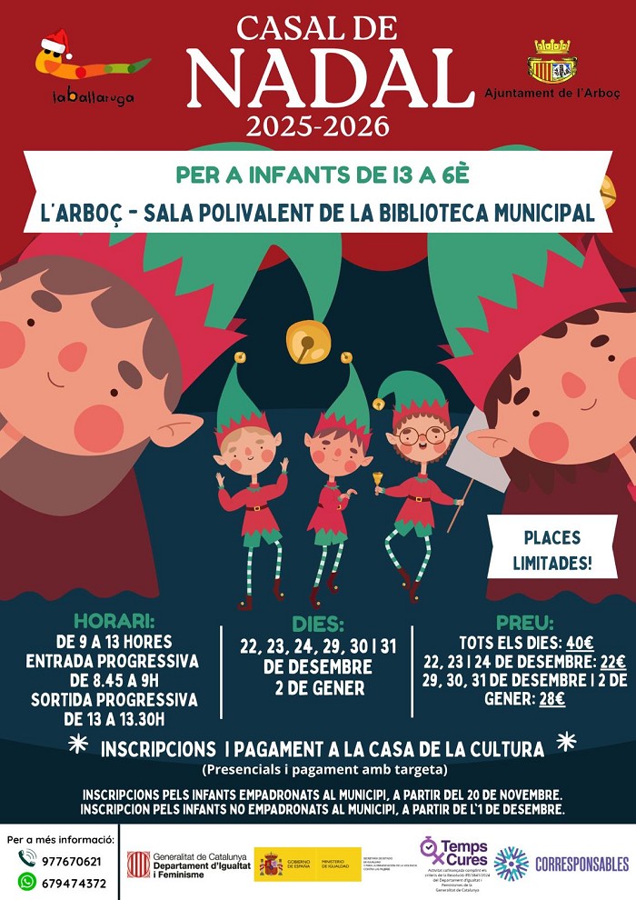 L’Arboç, 21 de novembre de 2025. L’Ajuntament de l’Arboç, en col·laboració amb La Ballaruga, entitat que organitza activitats extraescolars, posa en marxa una nova edició del Casal de Nadal 2025-2026, adreçat a infants des de 1r fins a 6è de primària. Les activitats es realitzaran a la Sala Polivalent de la Biblioteca Municipal, i les places són limitades.