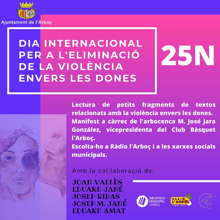 L’Arboç, 23 de novembre de 2020. La Regidoria d'Igualtat de l'Ajuntament de l'Arboç celebrarà d'una manera virtual el proper 25N, Dia Mundial contra la Violència de Gènere, amb l'enregistrament d'un video on 5 homes, representants de la societat arbocenca, i Montserrat Pérez, Regidora d’Igualtat, faran la lectura de varis fragments de novel.les on es reflecteix el maltractament vers la dona.