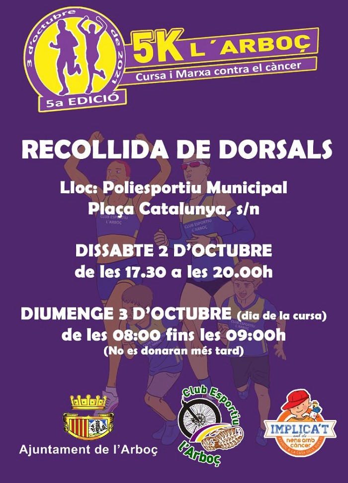 Recordem que la recollida de dorsals serā al Poliesportiu Municipal, Plaįa Catalunya s/n, el Dissabte 2 d'octubre de les les 17:30h a les 20:00h i el Diumenge 3 d'octubre de les 08:00h fins les 09:00h. Aquest esdeveniment és organitzat des de la Regidoria dEsports de lAjuntament de lArboį i el Club Esportiu lArboį.
